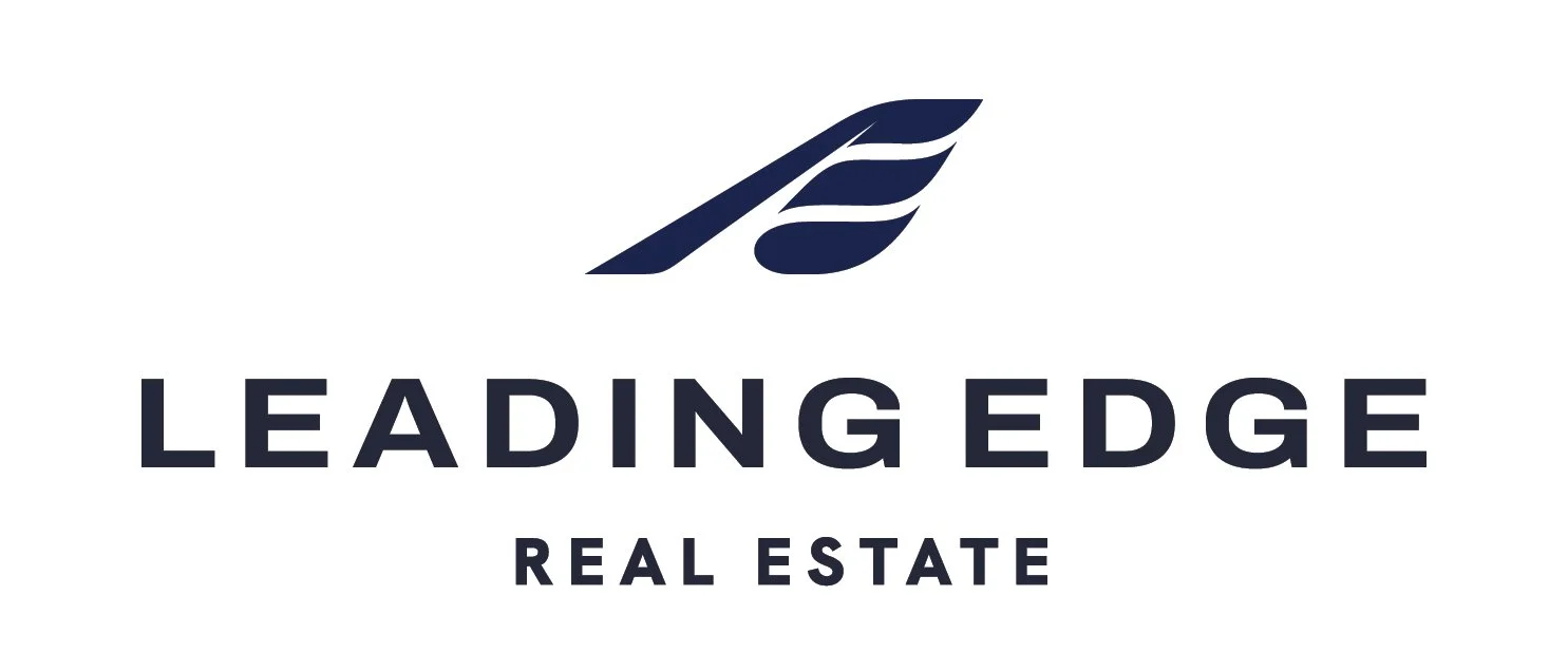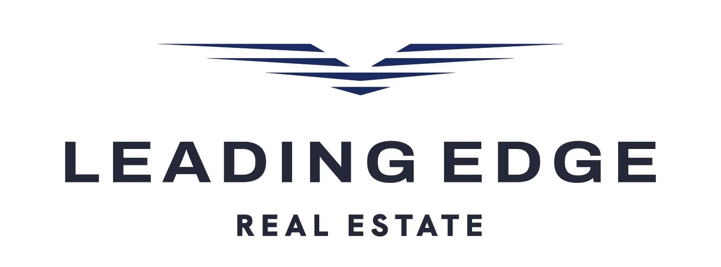 This logo for Leading Edge Real Estate retains the original icon with updated colors and the font from Option 1, creating a refined, contemporary look that reflects the brand’s precision and forward-thinking approach.
